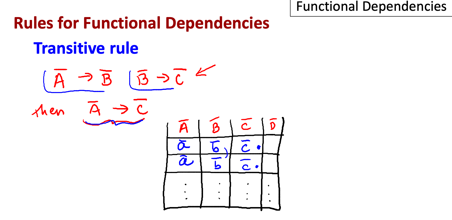 - A → B, B → C 이면 A → C