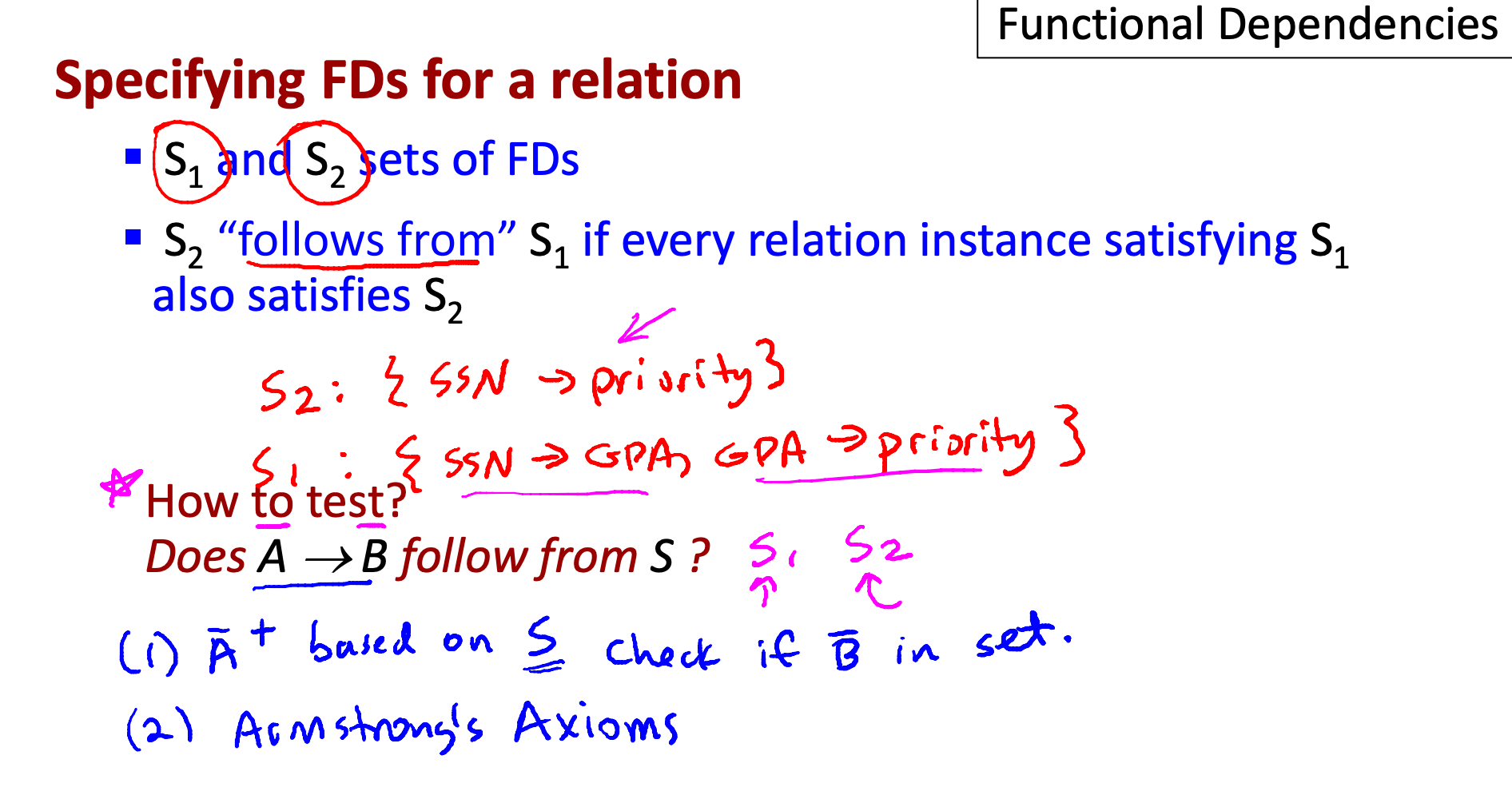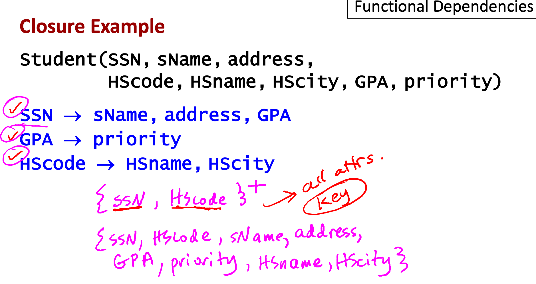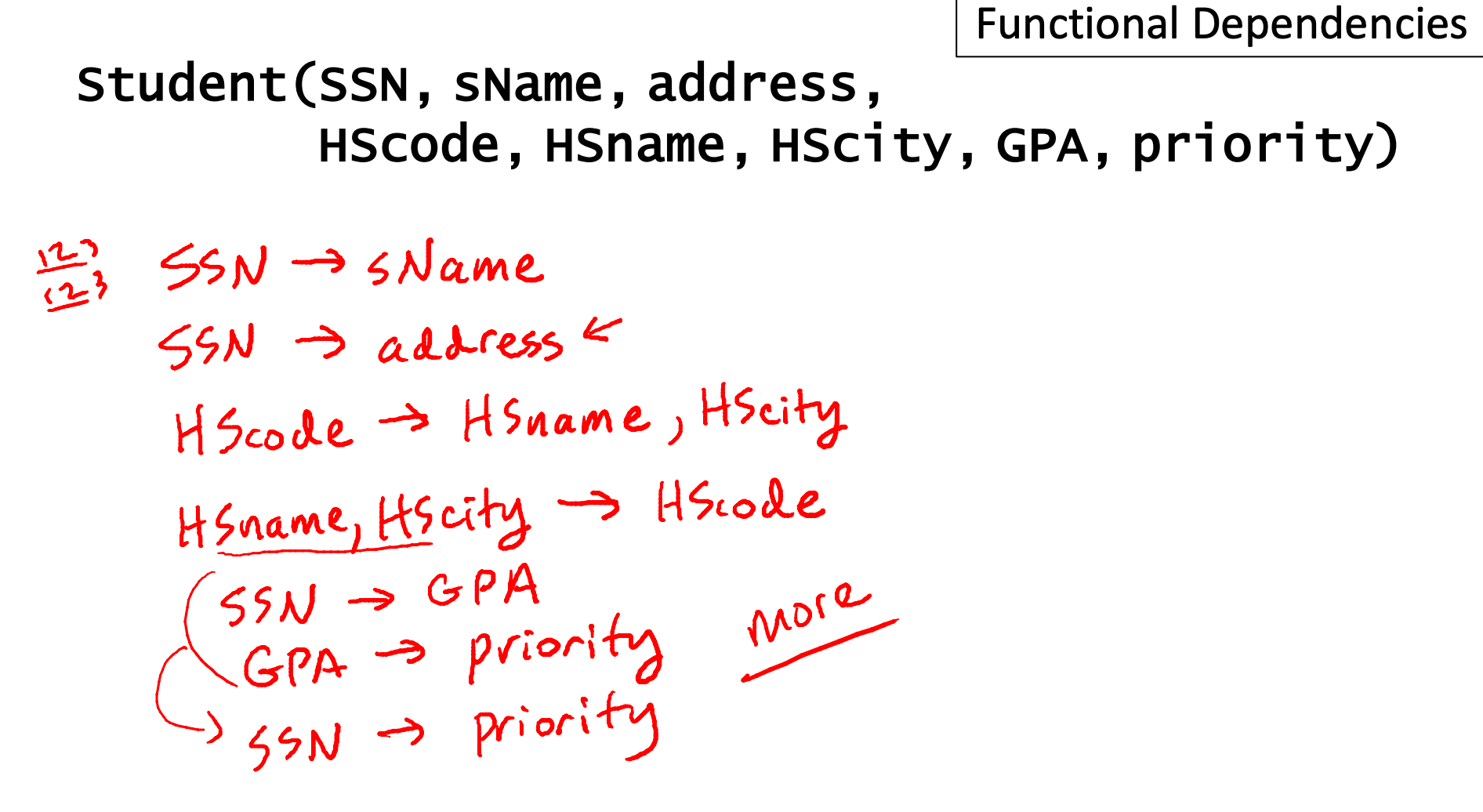 SSN -> priority: transitive rule로 두 개 FD를 보고 이렇게 쓸 수 있다
