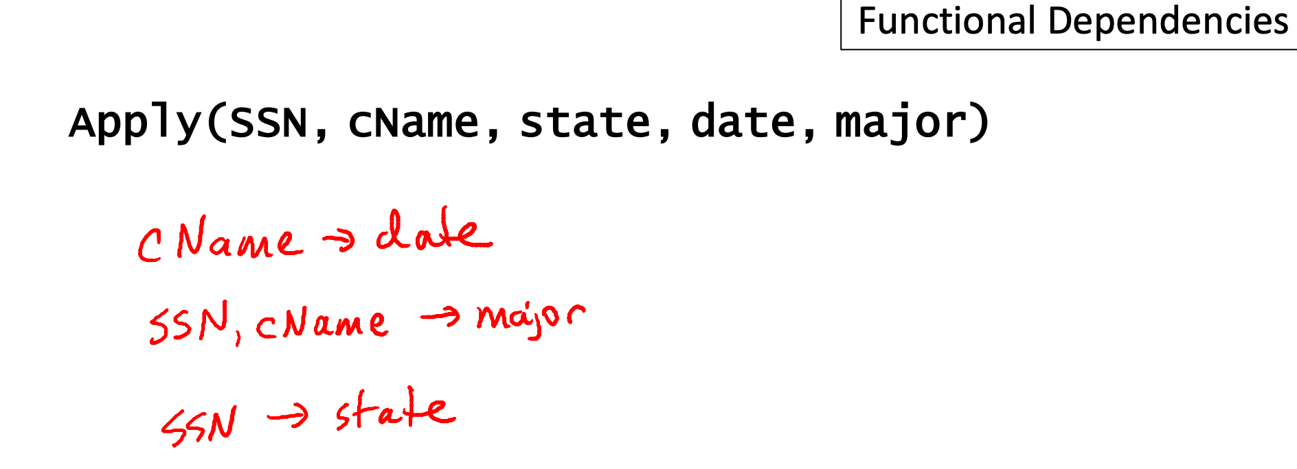 앞서 나온 Student Relation, Apply Relation에서 FD를 정리해보자