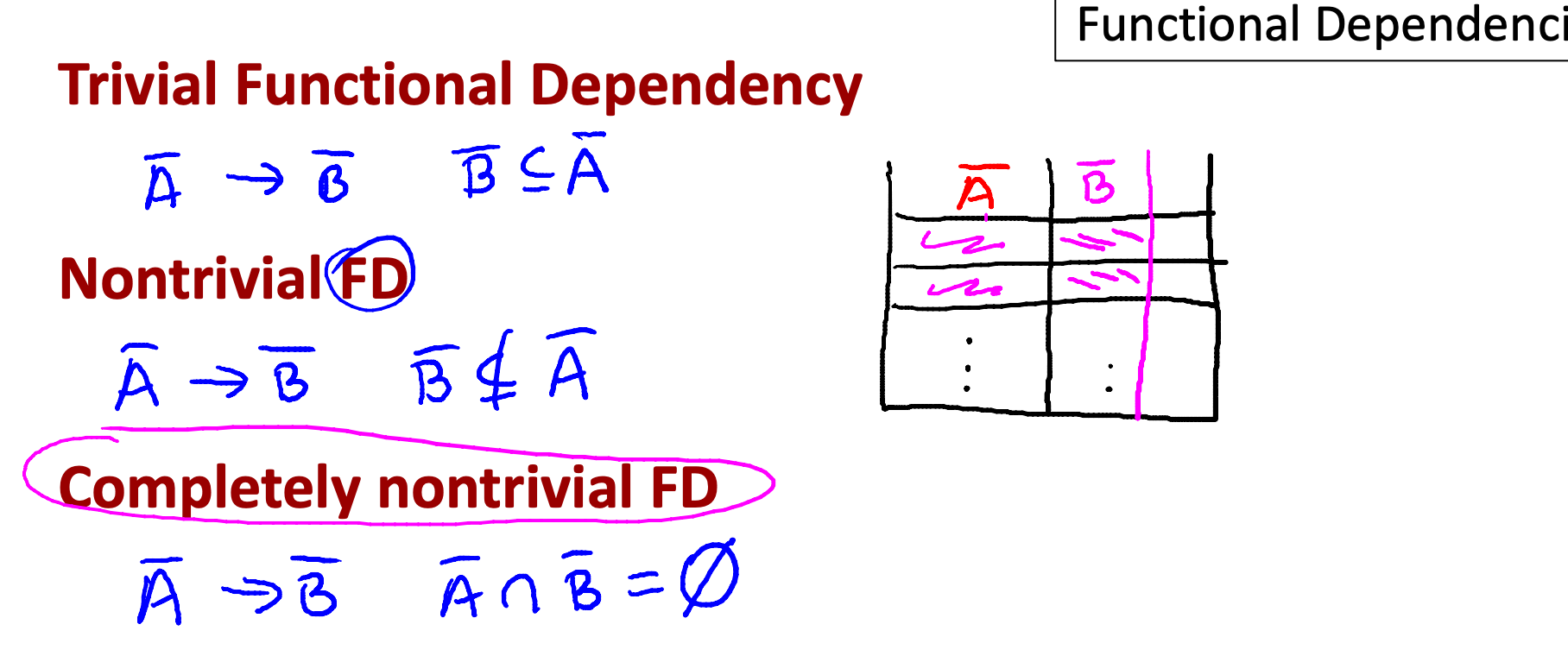 Nontrivial FD 케이스: set of attributes B가 set of attributes A 에 포함되지 않는다.