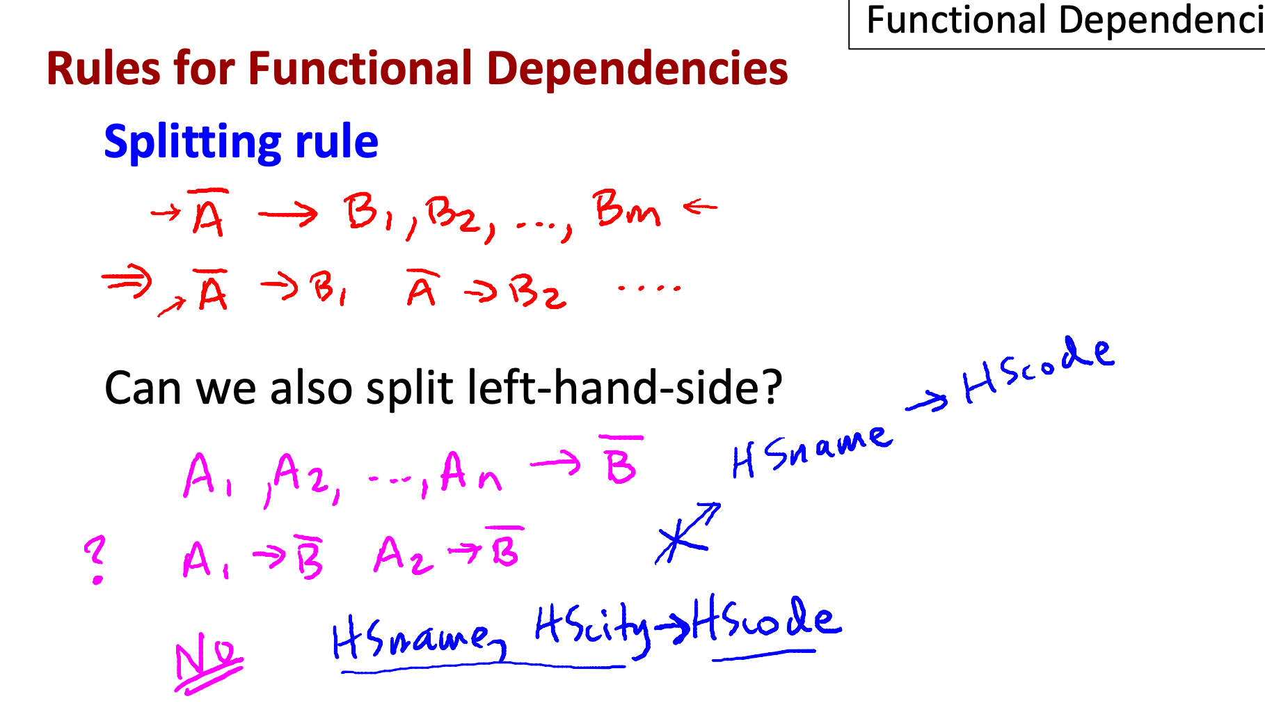 - A → BC는 A → B, A → C로 나눌 수 있음 → 분해