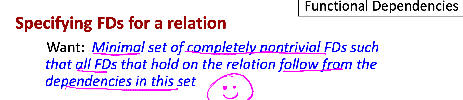 | All FDs follow from | 그 집합에 있는 FD들로부터 논리적으로 유도될 수 있는 모든 FD |