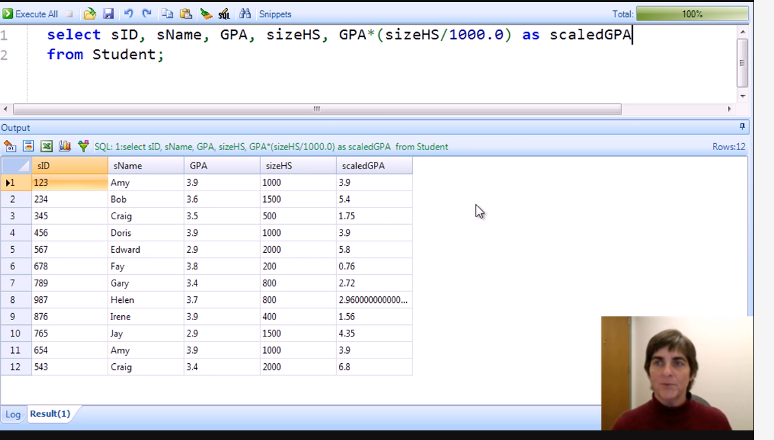 select sID, sName, GPA, sizeHS, GPA*(sizeHS/1000.0) as scaledGPA